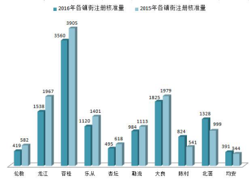 初步统计,2016年本区核准注册商标共12484件,同比2015年减少7.18%,其中新增集体商标1件。各镇街增长情况下图,同期相比,虽然大部分镇街增长的速度有所下降,但我区累计有效商标注册量始终保持着比较强劲的增长势头。